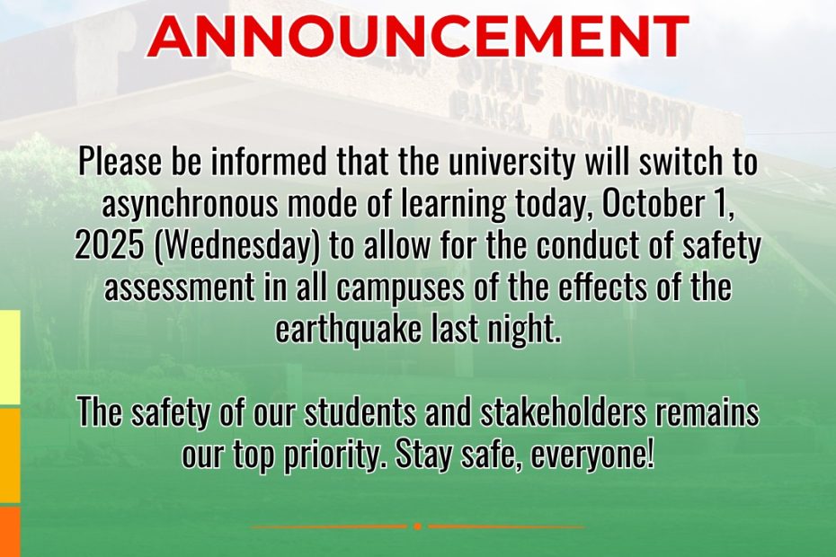 Please be informed that the university will switch to asynchronous mode of learning today, October 1, 2025 (Wednesday) to allow for the conduct of safety assessment in all campuses of the effects of the earthquake last night.
